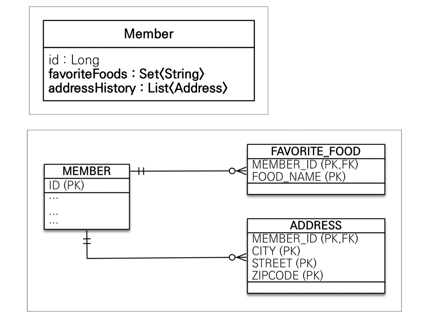 member.setFavoriteFoods.add("치킨"); member.setFavoriteFoods.add("피자"); member.setAddressHistory.add(new Address("city1", "street1", "10000")); member.setAddressHistory.add(new Address("city2", "street2", "20000"));- 이런식으로 저장시 FAVORITE_FOODS, ADDRESS 테이블에 각각 저장 됨