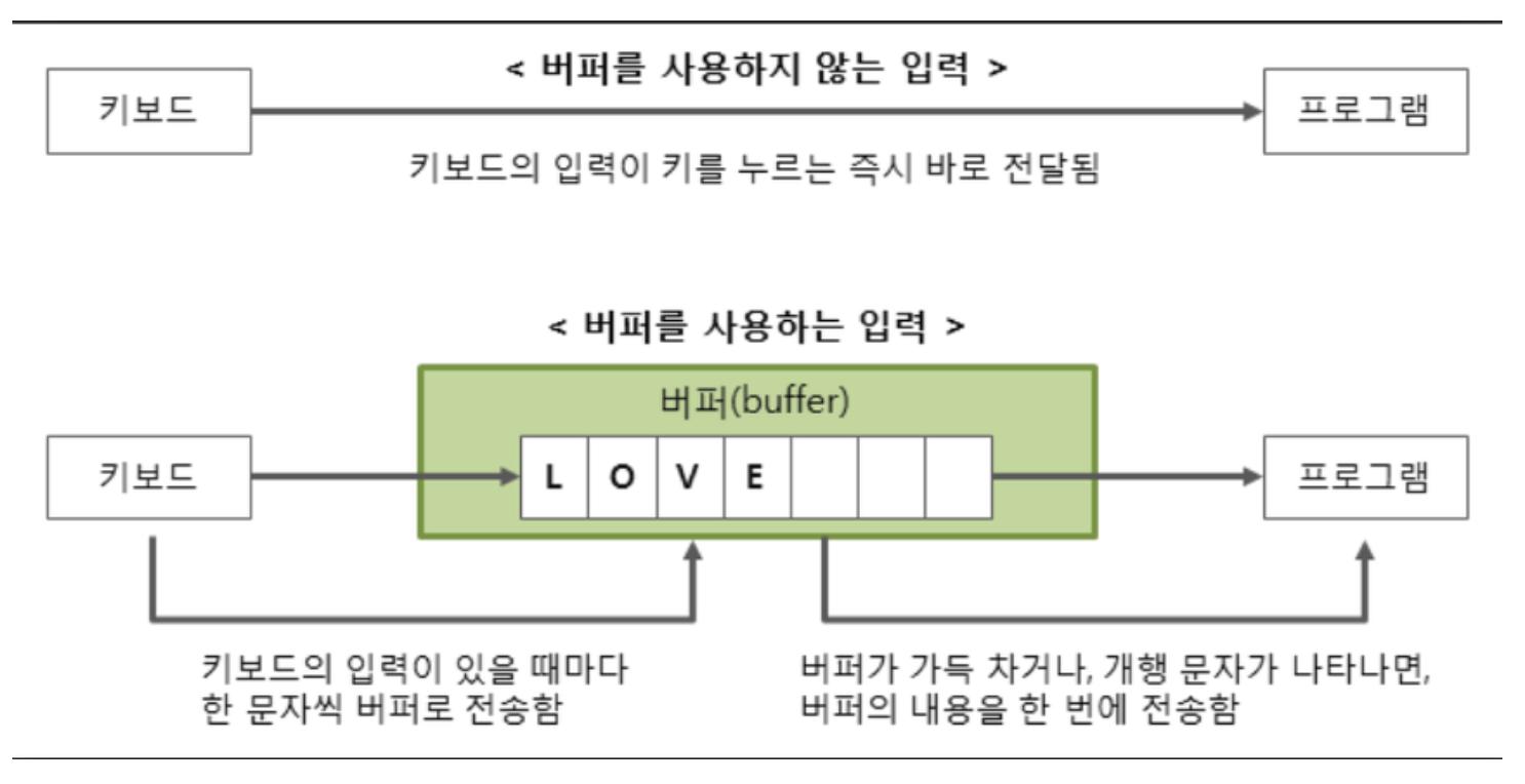 버퍼링 없이 문자의 정보를 목적지로 바로 이동시키는 것 보다 중간에 메모리 버퍼를 둬서 묶어서 이동시키는 것이 효율적이고 빠르다.
